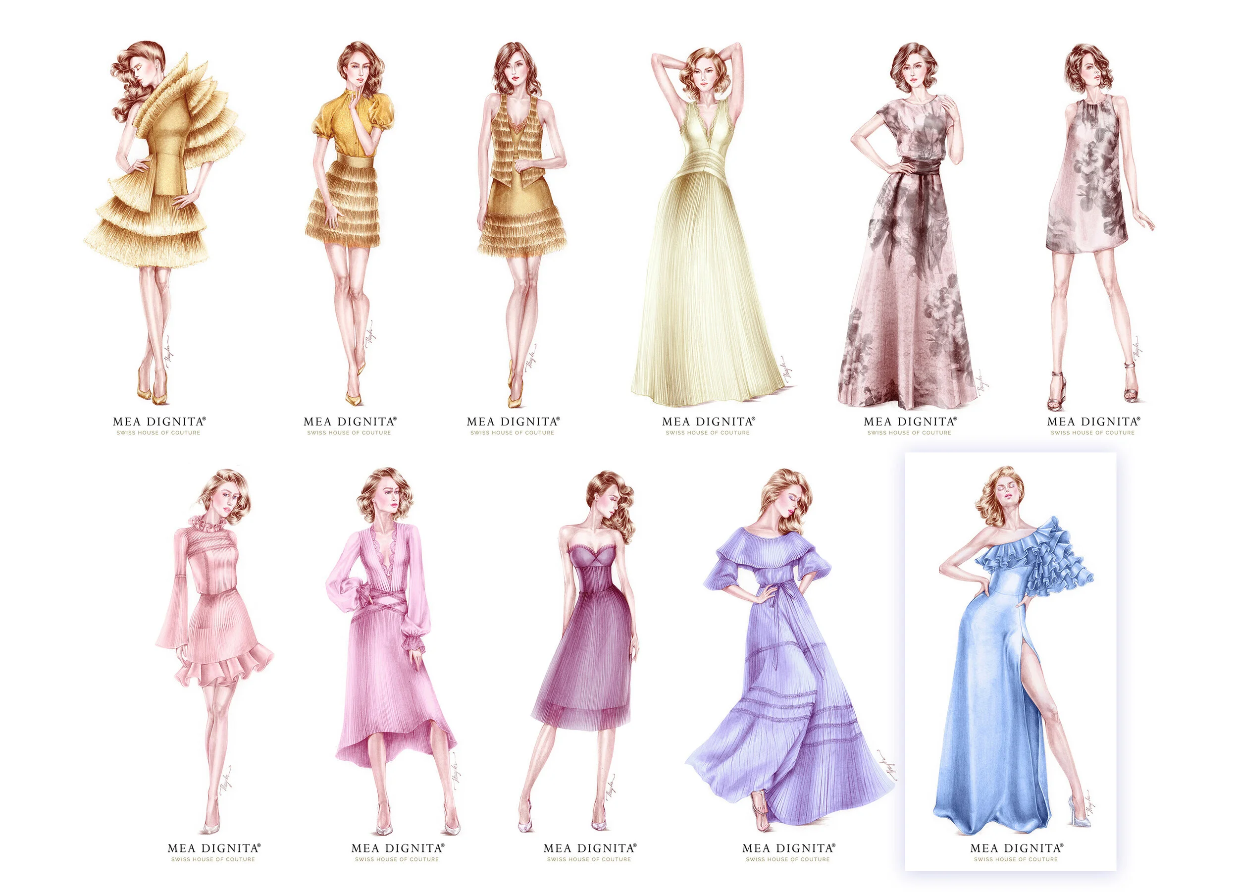 If you haven't read my previous post "Fashion illustrations for Mea Dignita- Swiss house of couture's new collection", I do highly recommend you to read it before this one because they are respectively connected. I believe it will help you understand this one better.