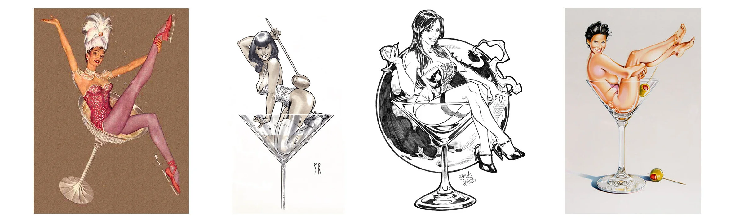 "There Is Nothing New Under The Sun”. Ecclesiastes 1:4-11. I think I should also state that drawing a model with a huge cocktail is not a new idea, you can see that in burlesque shows all the time and other artists did it before (see pictures below). The key point here, in my opinion, is that even though that's not a new idea, you still can create something new in your style, showing your mark and vibe. My girl should be suitable to show Mea Dignita's spirit and be different from other artists' girls. That was what I aimed for.