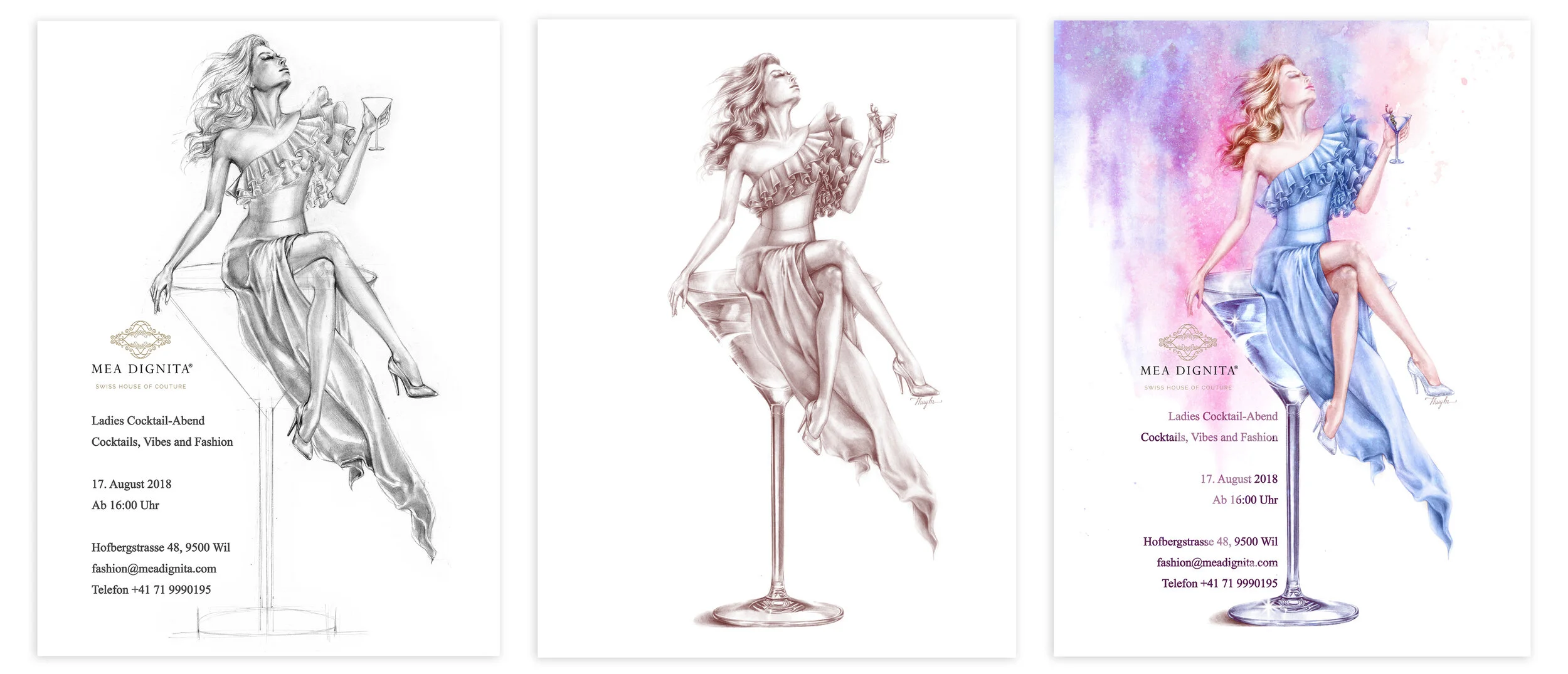 Như thường lệ, sau khi kết thúc thảo luận xong tất cả các chi tiết, mình vẽ phác thảo cho khách hàng xem. Vì minh họa thời trang này sẽ được sử dụng như thiệp mời cho đêm tiệc nên khi lên bố cục mình đã phải tính toán phần không gian để đặt các thông tin cần thiết về nhãn hàng, thời gian, địa điểm, vv. như một phần của bức tranh. Mình rất thích cách một tay của cô gái chỉ vào logo, cách những dòng text được sắp xếp để chạy theo hình của chiếc ly một cách hài hòa. Mea Dignita cực kì ưng ý với bản phác thảo này nên mình vẽ chì lên thật chi tiết rồi tô màu bằng Photoshop. Mình muốn có hiệu ứng nước chảy như khi rượu/ cocktail chảy cùng sự lấp lánh của buổi tiệc sang trọng để cộng hưởng với mái tóc bồng bềnh và chiếc đầm tung bay của cô gái, đó chính là phần để các hiệu ứng màu nước phát huy tác dụng. Các bạn có thể xem các công đoạn vẽ của mình từ lúc phác thảo đến lúc hoàn thành ở phía dưới nhé: