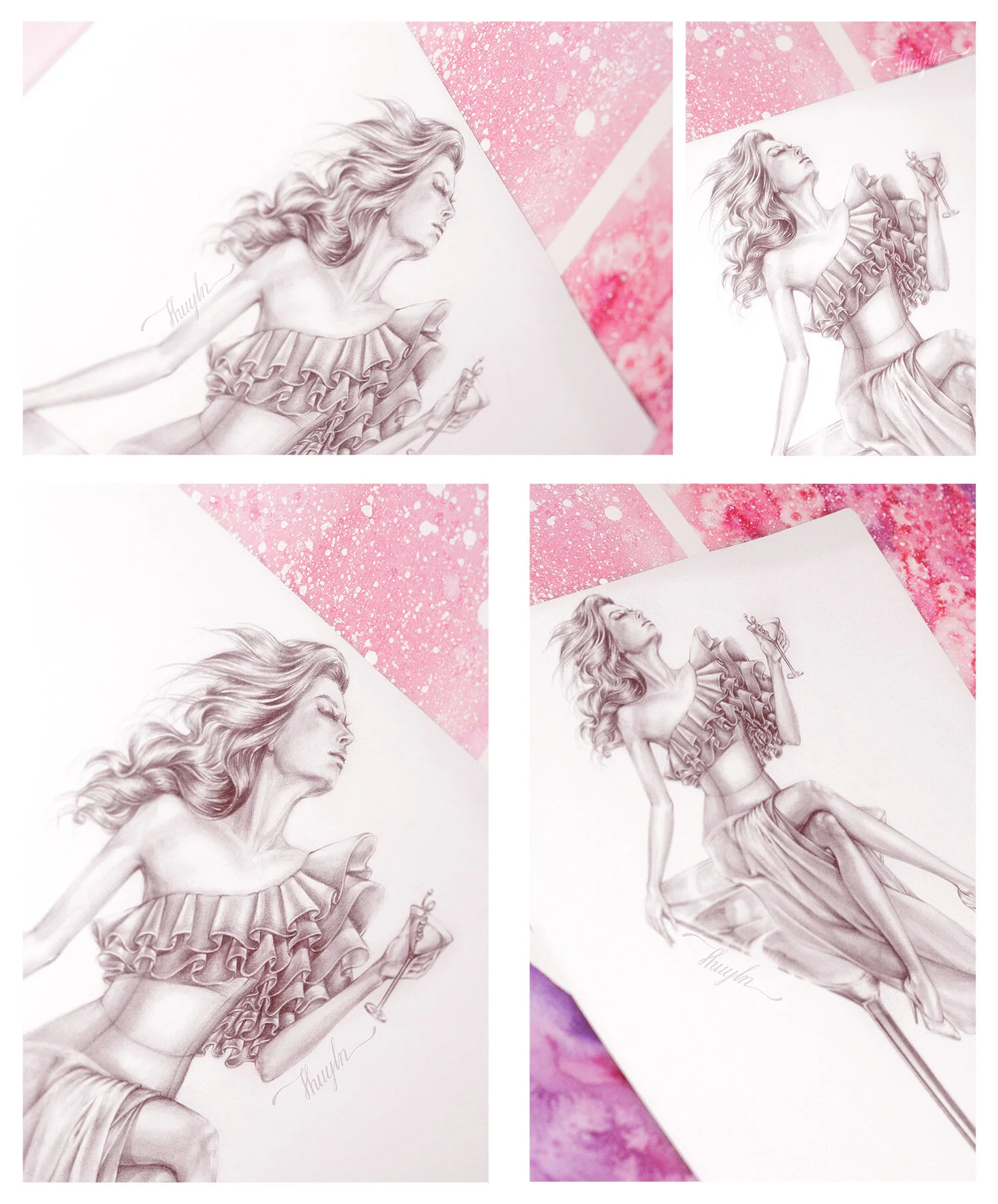 As usual, after finishing discussing all the details, I went ahead and drafted a pencil drawing to show the client. Since this is a fashion illustration used as a party invitation, I had to think about the space to put information regarding the brand, time, location, etc. in it as a part of the whole artwork. I love how one of the model's hands points to the brand's logo and the text harmonically goes along with the glass. Mea Dignita was very happy with the draft so I drew it in detail with pencil then colored it with Photoshop. I wanted to have flowing liquid effects like wine/ cocktail when they flow and sparkles of the luxury party to resonate with the model flowing hair and dress; that was when watercolor effects came in. You can see pictures showing my drawing process from start to finish below: